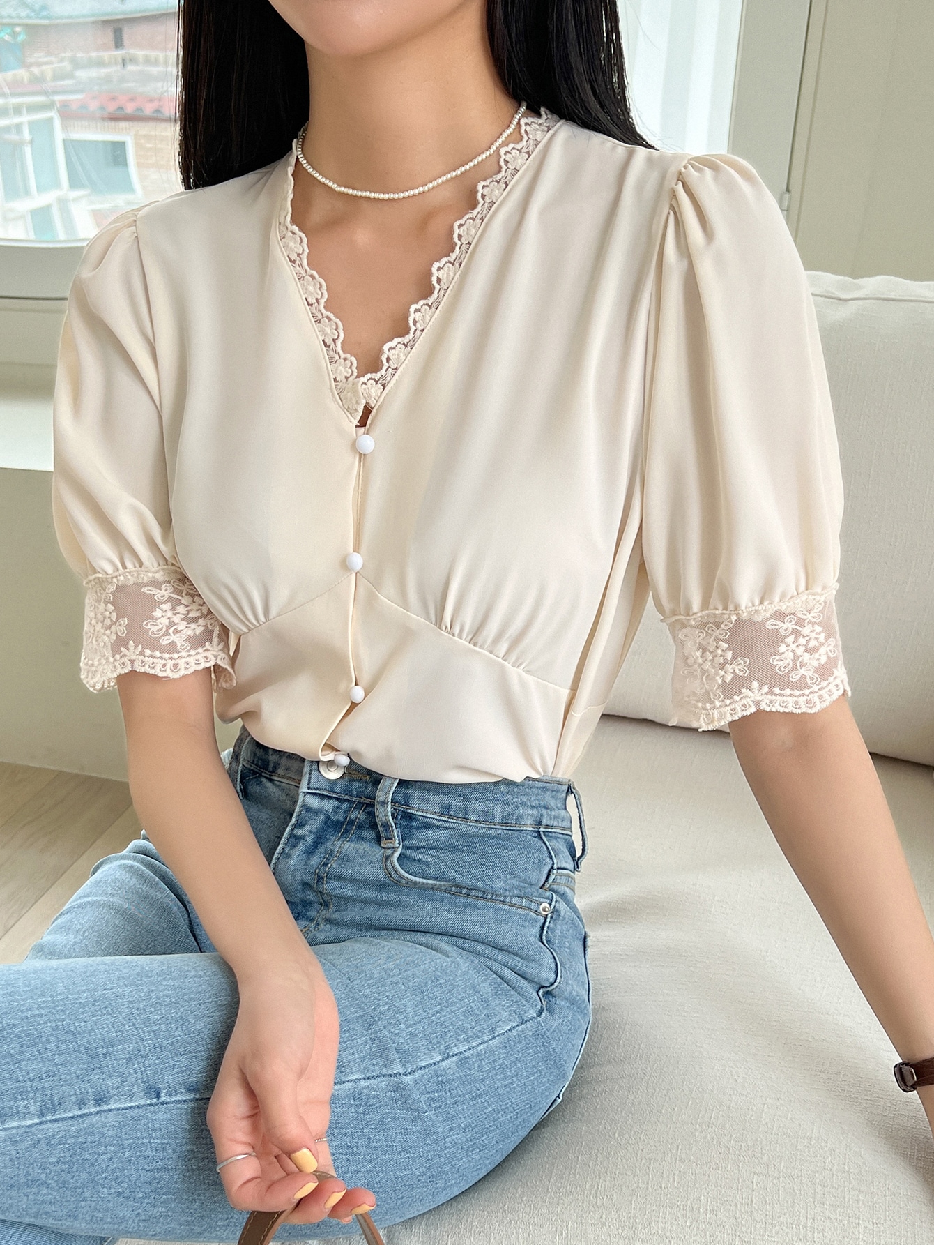 Details: Contrast Lace, Button Front