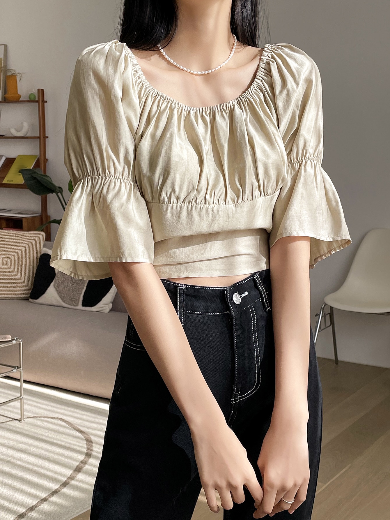 DAZY Ruched Bust Tie Back Flounce Sleeve Blouse