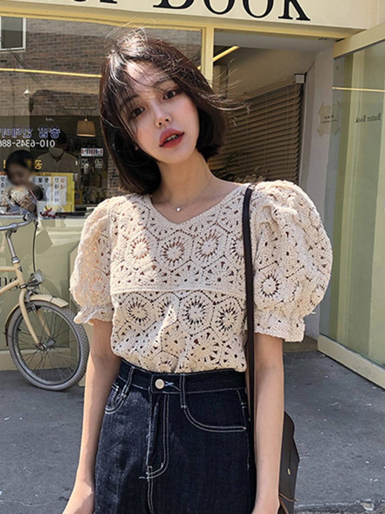 DAZY Solid Puff Sleeve Pointelle Detail Crop Blouse