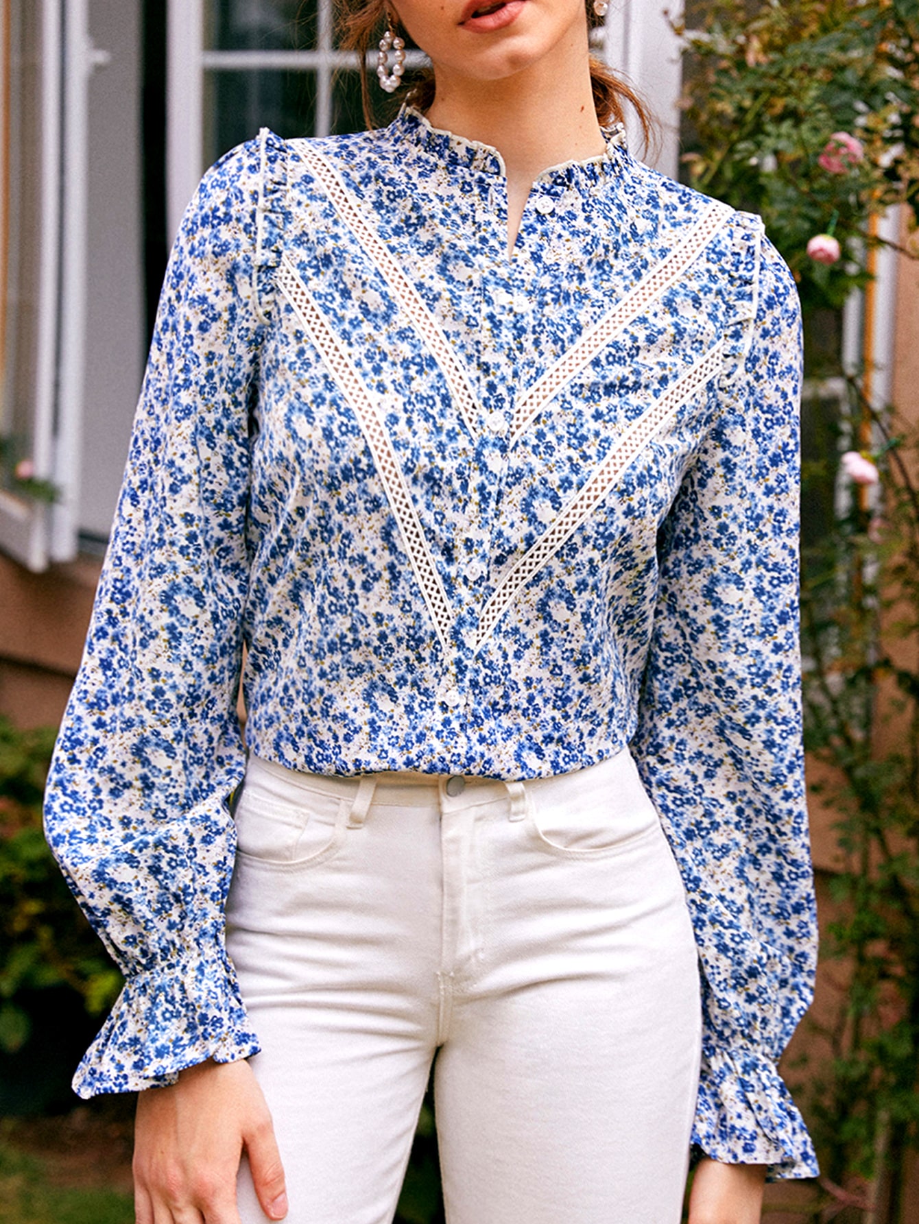 Details: Ruffle, Contrast Lace, Frill, Button Front
