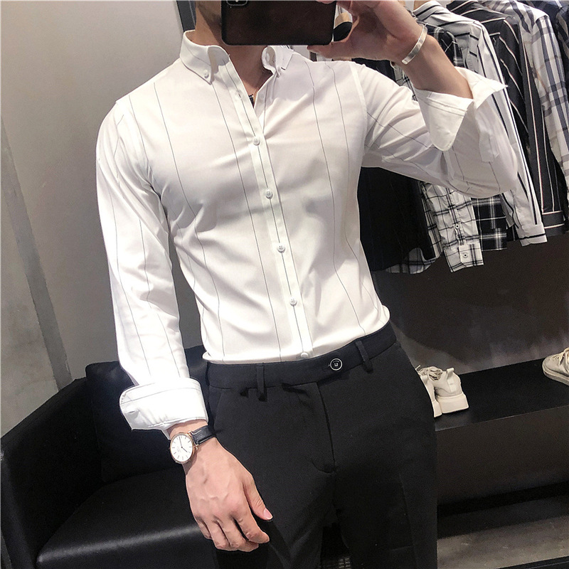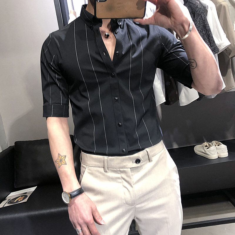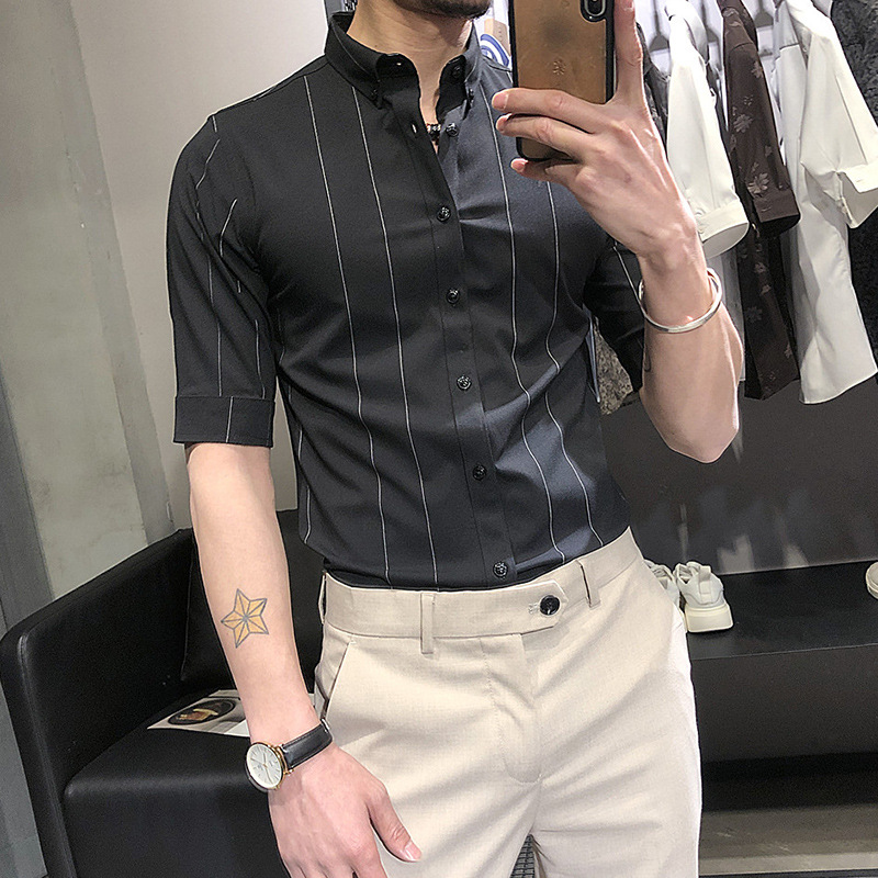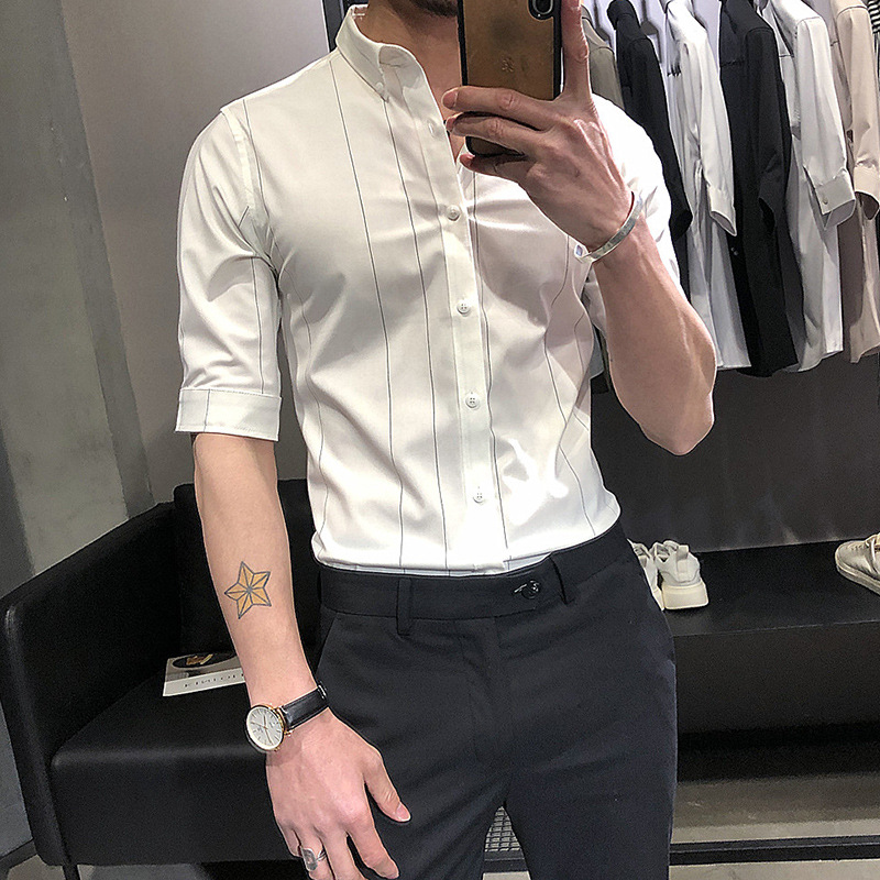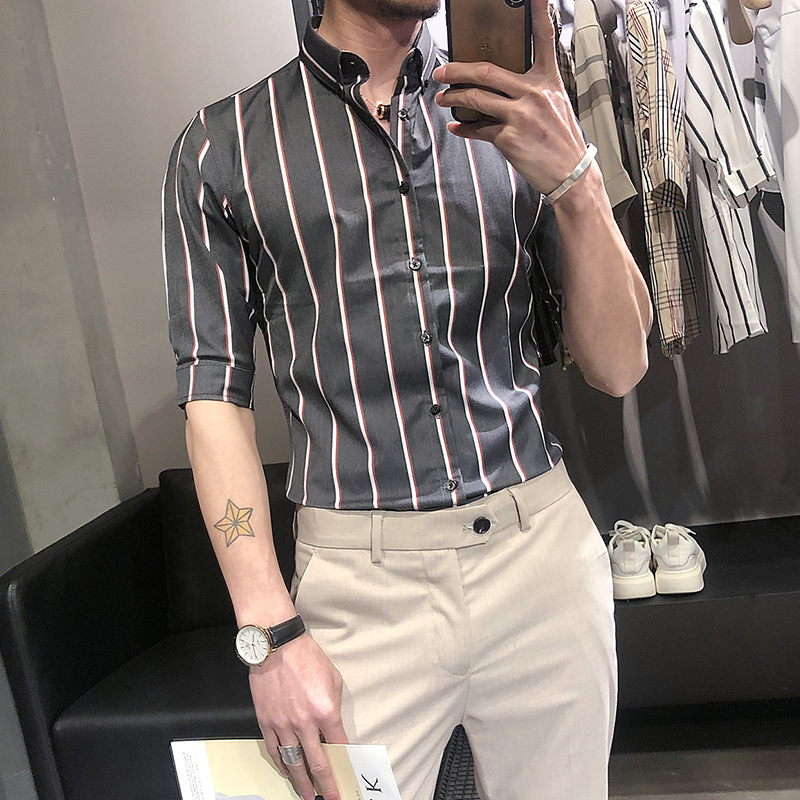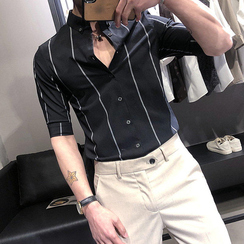 Men’s Vertical Striped Shirt Short-sleeved Korean Version Of The Trend Of Self-cultivation Handsome Ice Silk Long-sleeved Ruffian Handsome Seven-sleeve Shirt