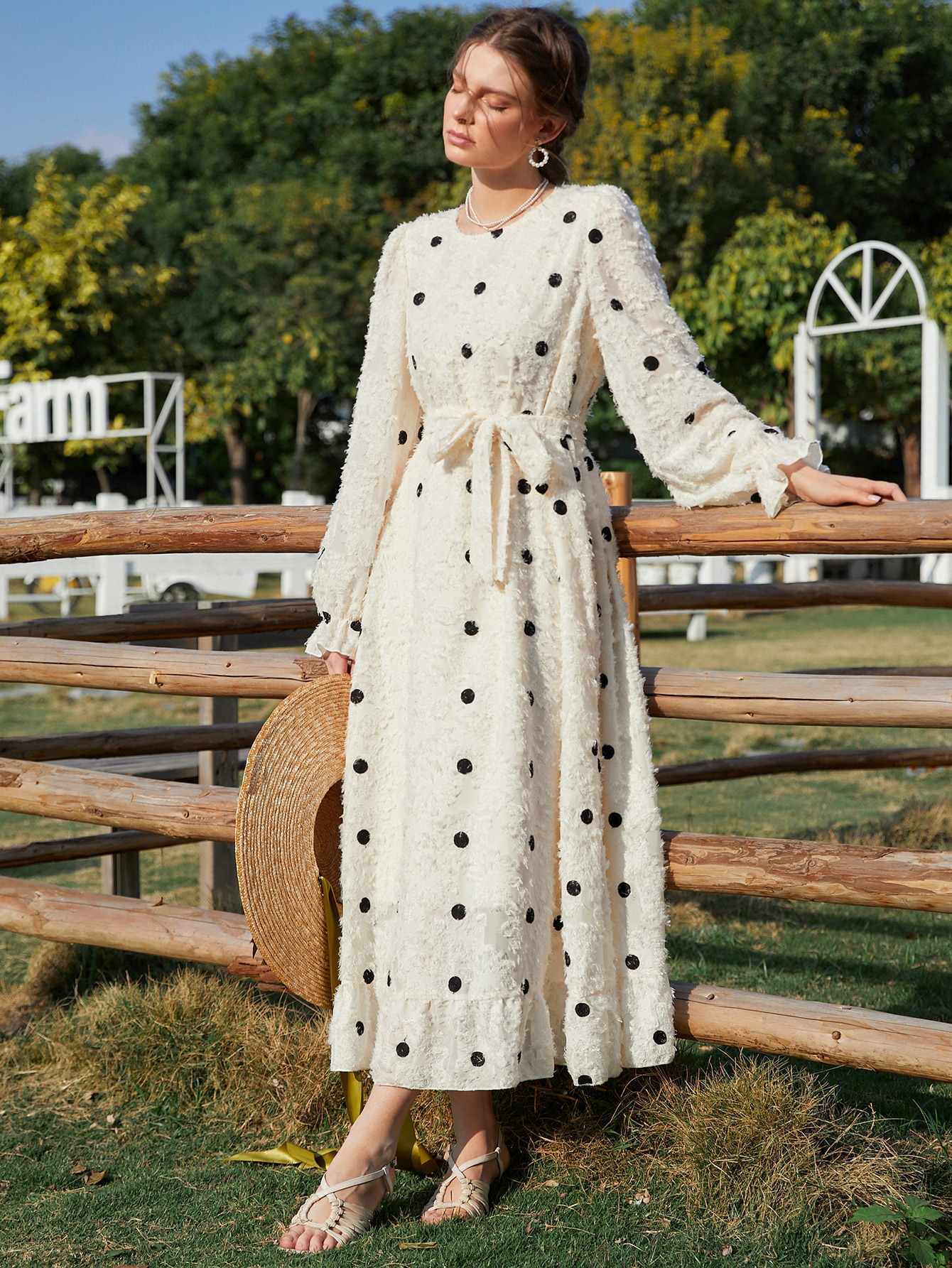 Polka Dot Flounce Sleeve Ruffle Hem Belted Dress