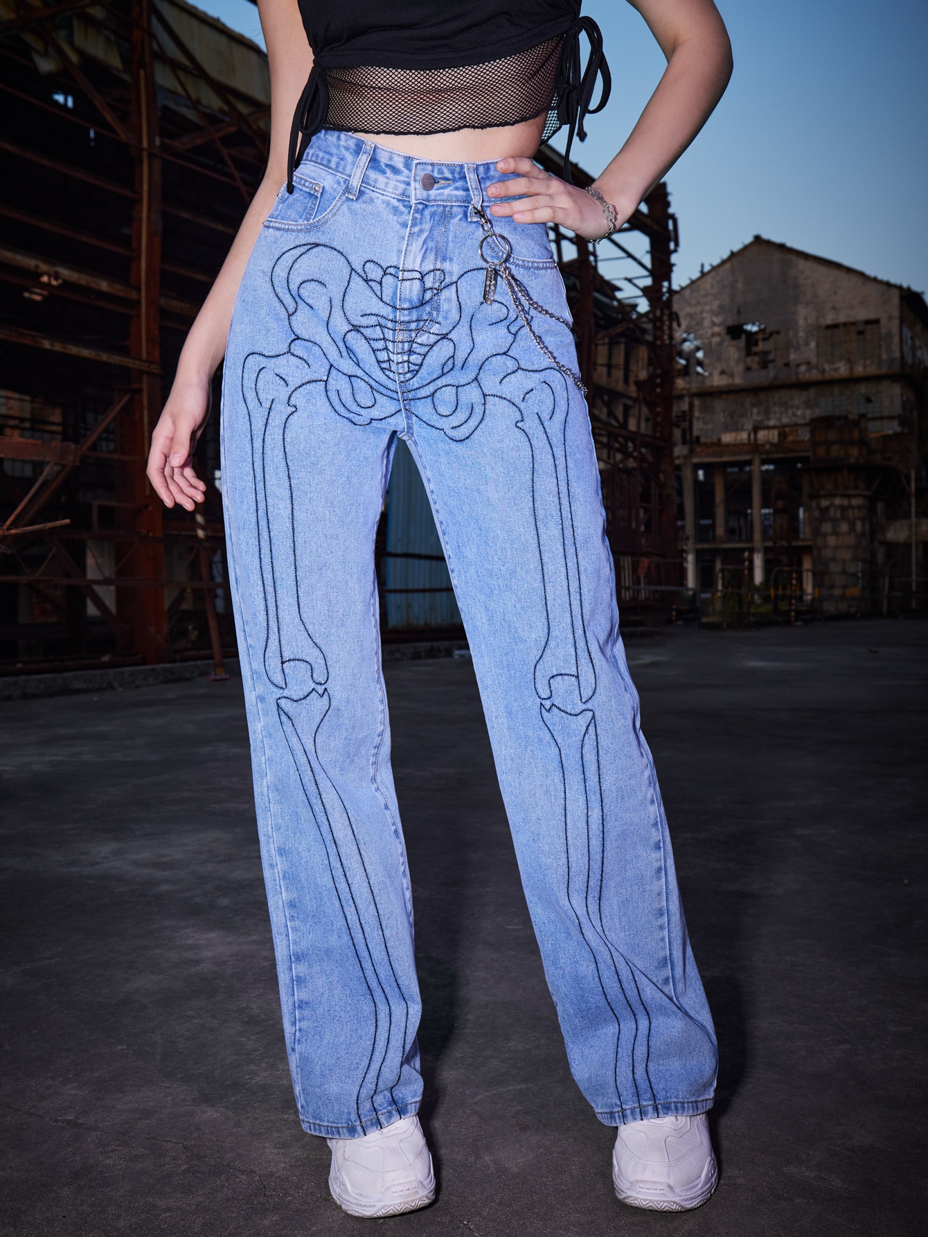 ROMWE Punk Rock Bone Print Slant Pocket Jeans