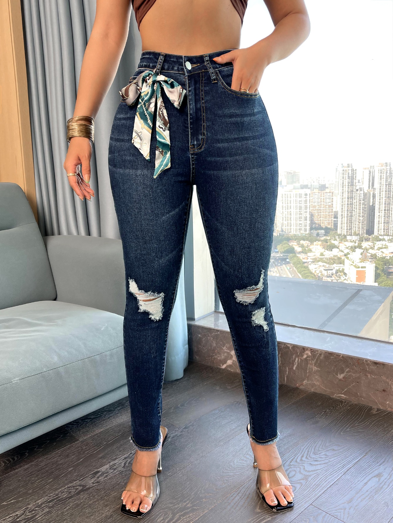 SEXY High Waist Ripped Raw Hem Skinny Jeans