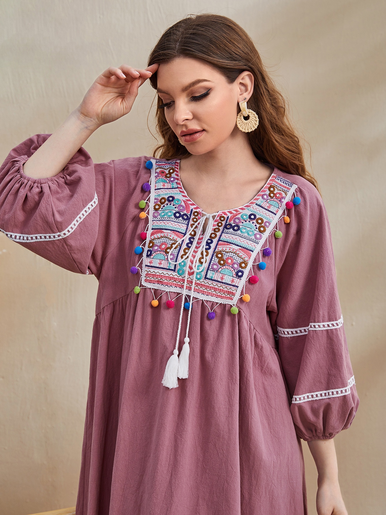 Tie Neck Bishop Sleeve Pom Pom Embroidery Dress